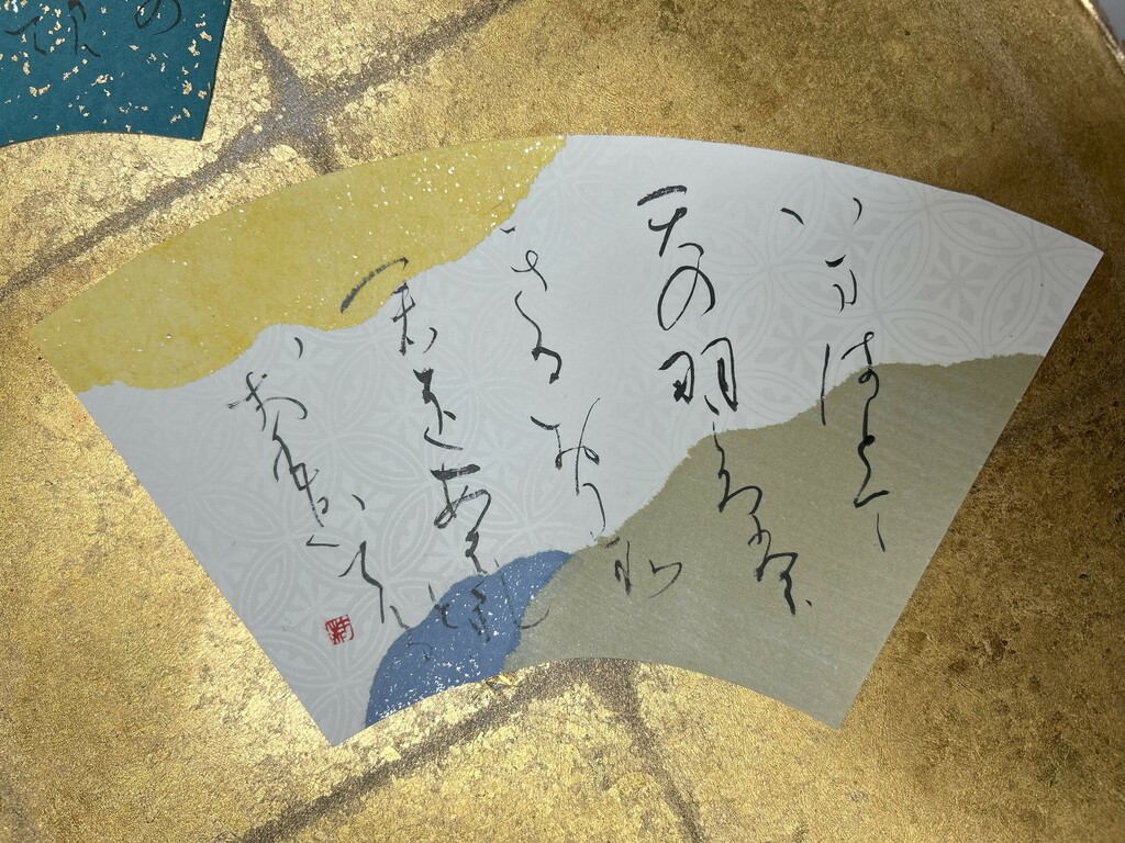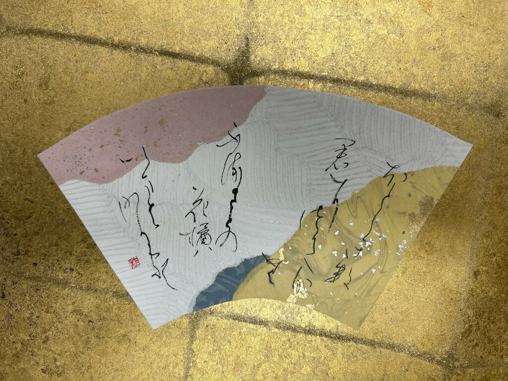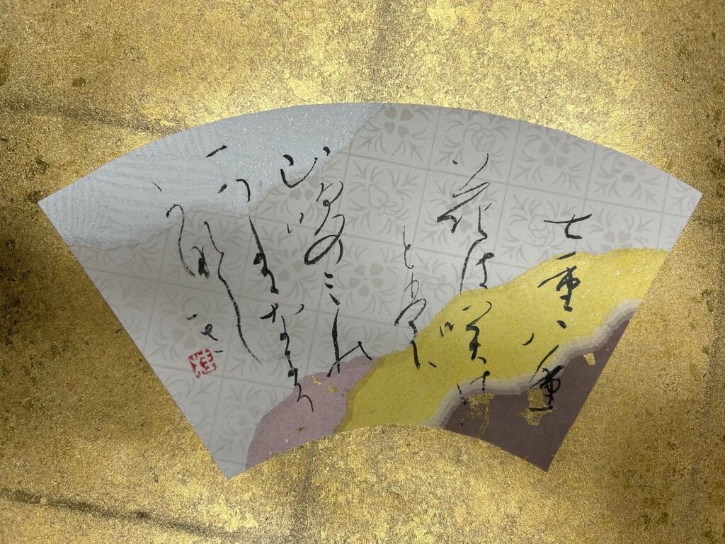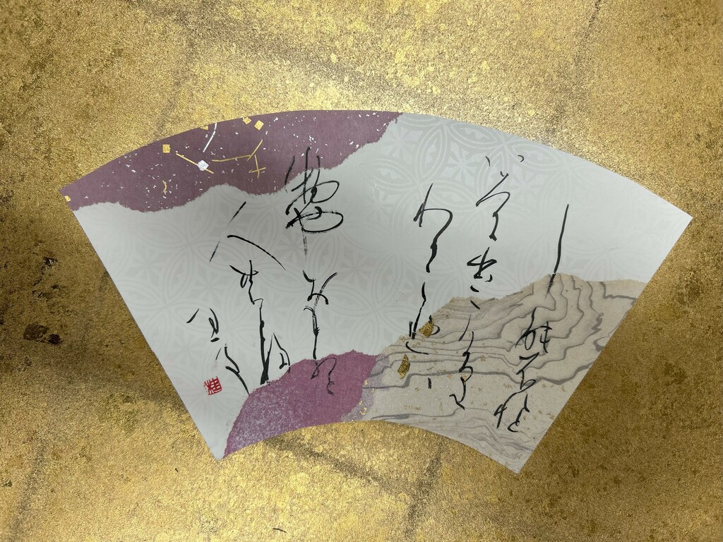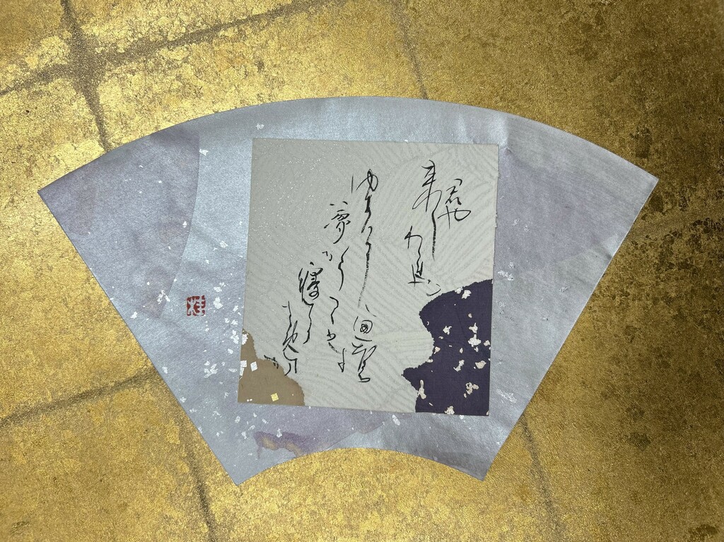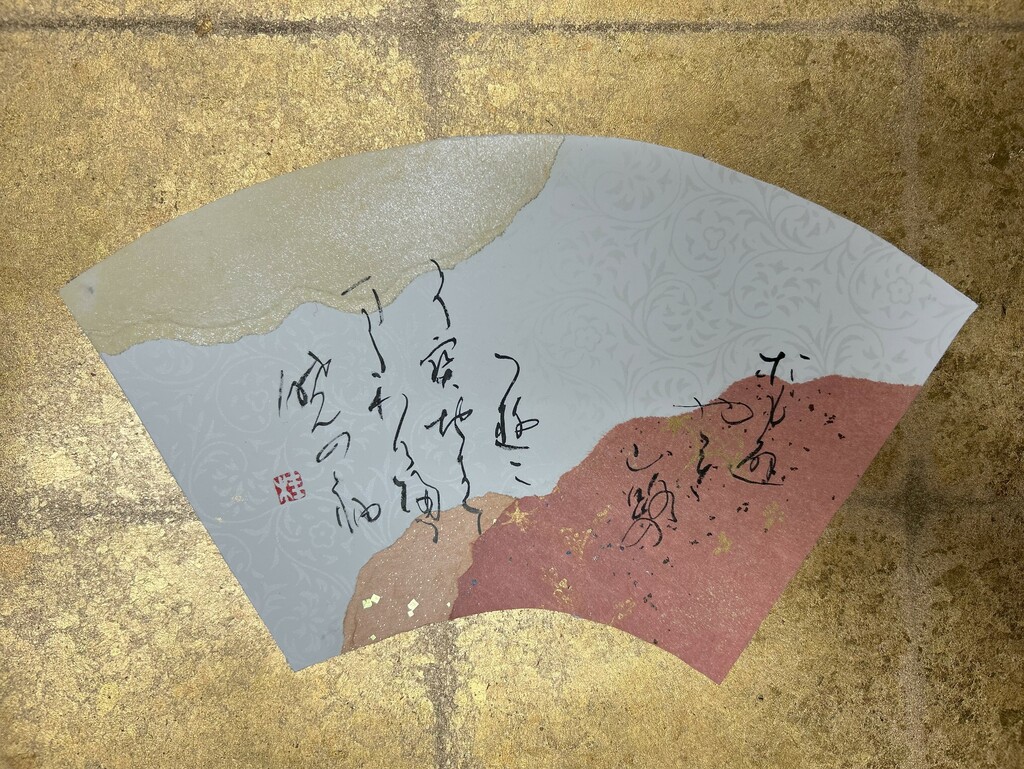 右下に暗めの色、左下に明るめの色を配置することで、和歌の下の句の「夢かうつつか寝てかさめてか」を表現しました。背面の扇形の紙は、塩出先生が用意してくださったものです。銀色がとても綺麗で、より素敵な作品になりました。