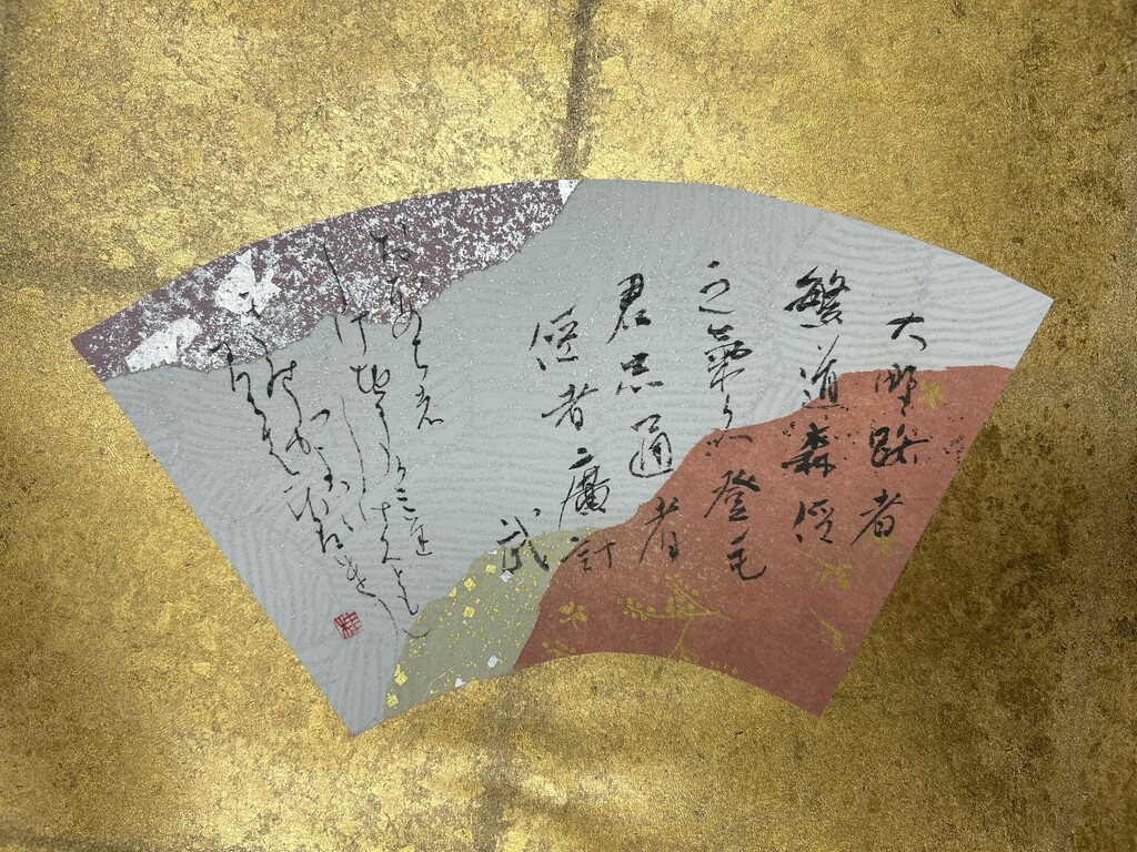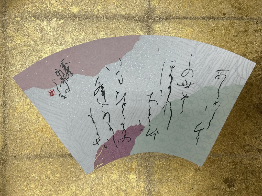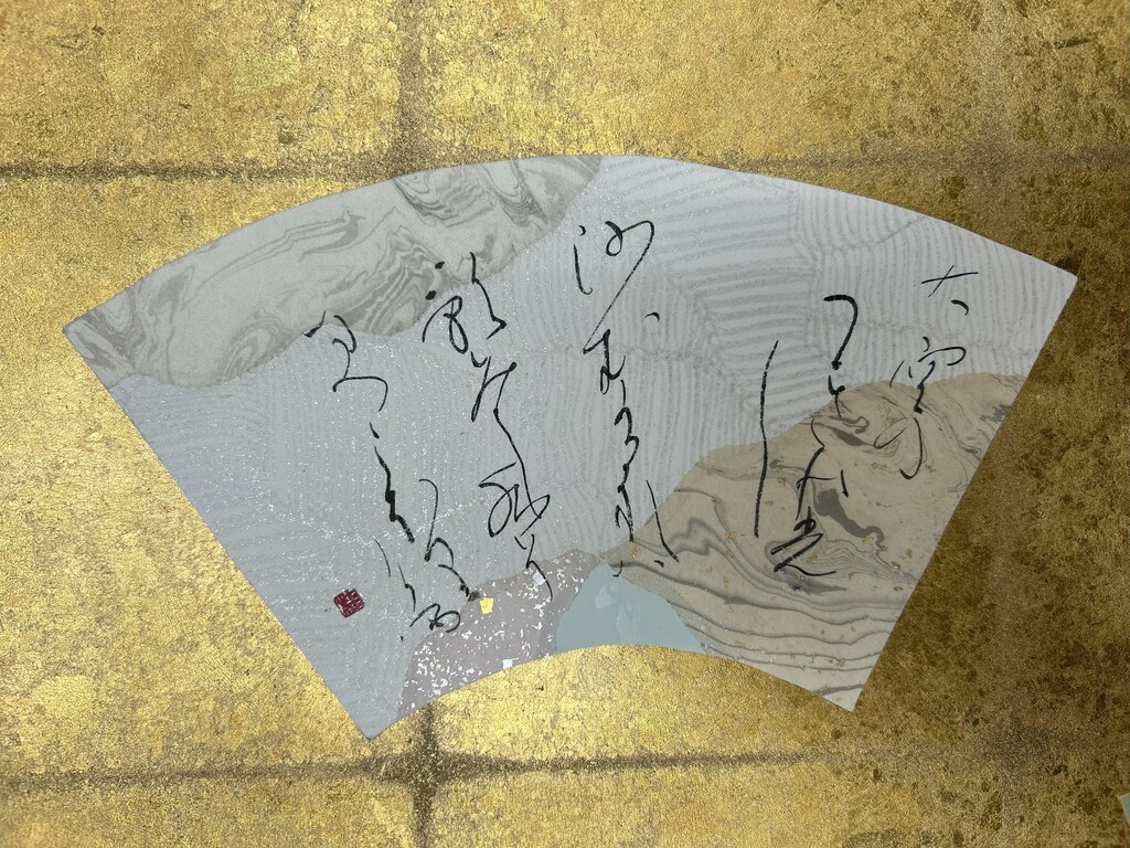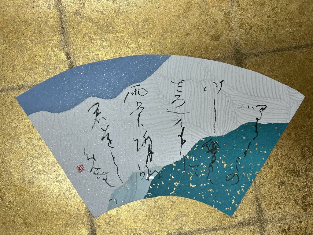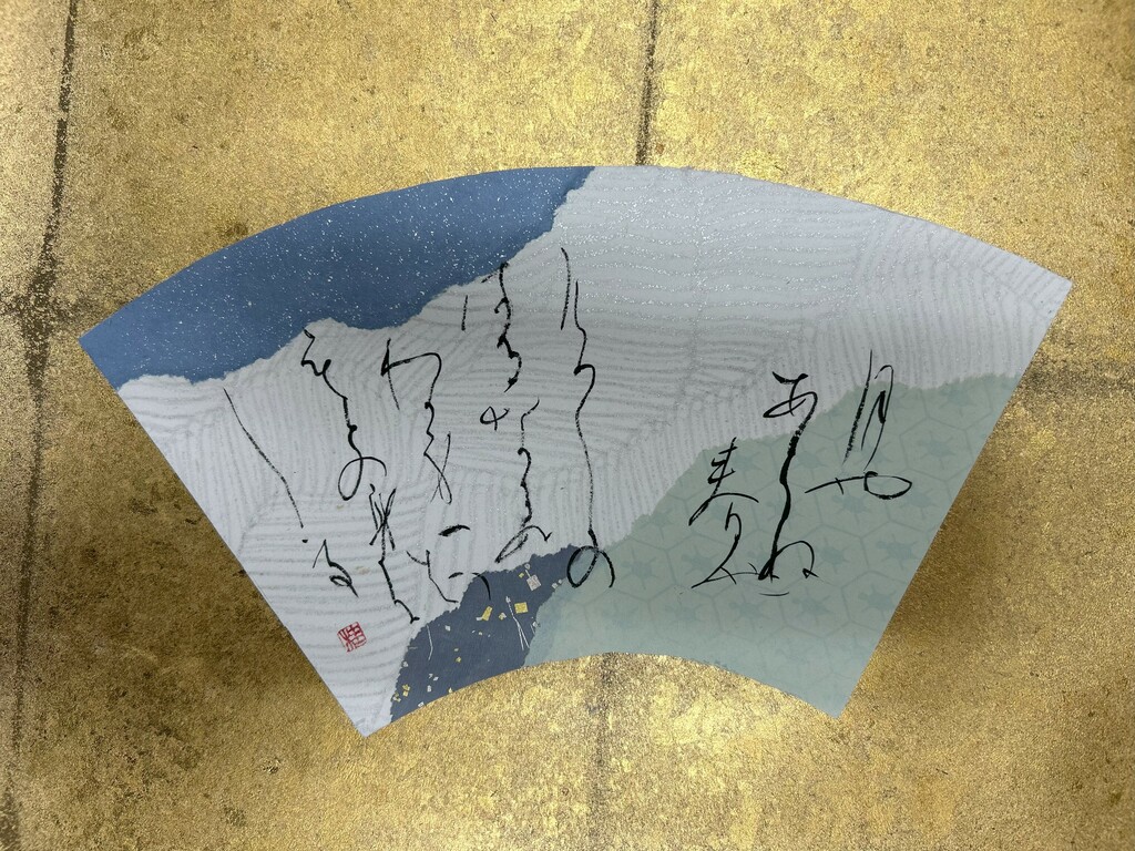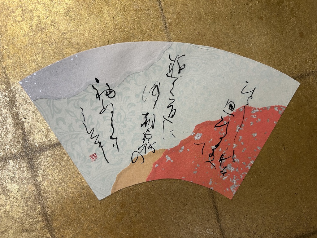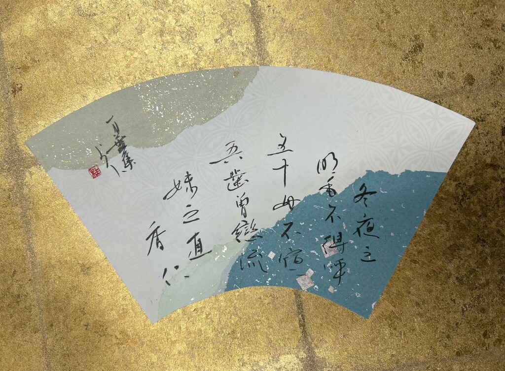 右下に暗めの色、左下に明るめの色を配置することで、和歌の下の句の「夢かうつつか寝てかさめてか」を表現しました。背面の扇形の紙は、塩出先生が用意してくださったものです。銀色がとても綺麗で、より素敵な作品になりました。