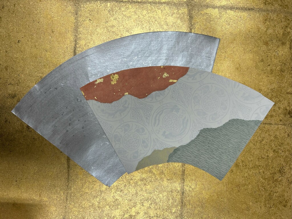 煌びやかなイメージと幽玄とが合わさった雰囲気を出してみようと思いました。広い中央部分の紙は、その色こそ落ち着いていますが、中華的なイメージをも感じさせる模様がびっしりとあります。それらが合わさって少し混沌とした感じも出ているかもしれませんが、それは私の好きな近世初期の雰囲気に通ずるものがあるかもしれません。