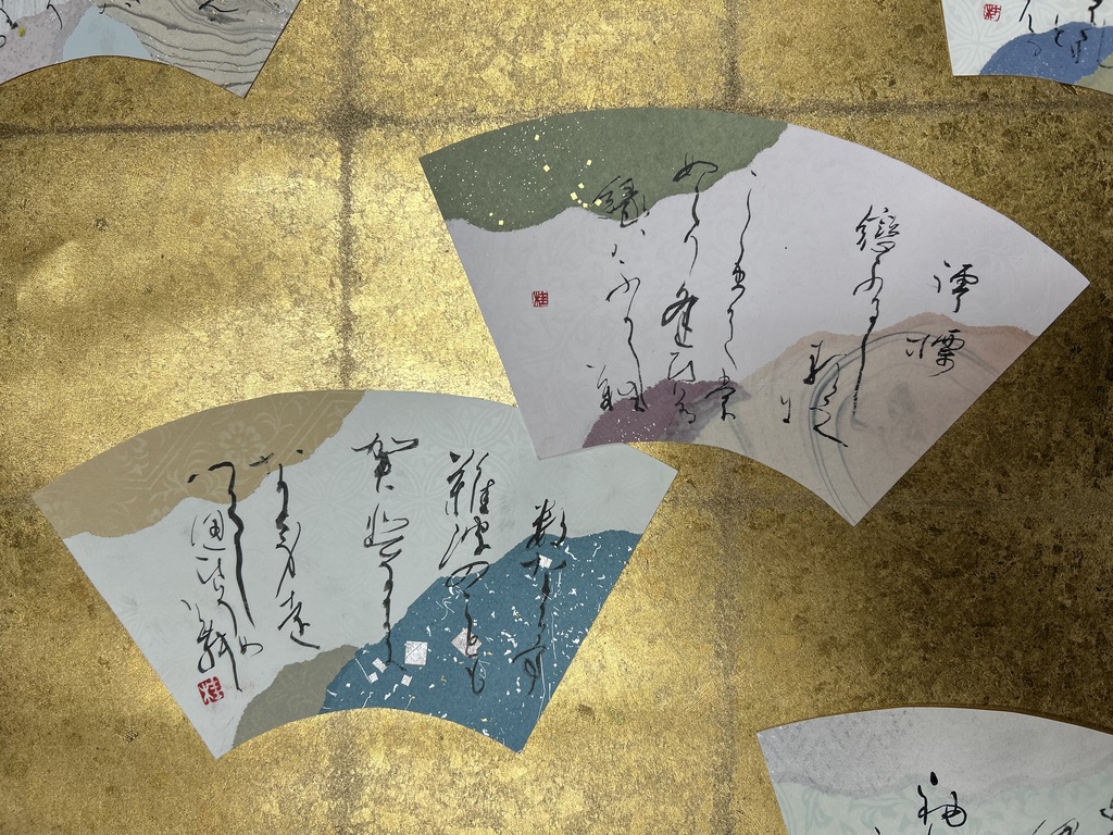 左:本場面に登場する「松原の深緑」という語から、住吉の美しい風景を思い描きつつ、歌を受け取る源氏の煌びやかで、力強い様子をも想像しながら色を選びました。扇を並べて飾った時に、金箔と銀箔が対応するように料紙を選びました。
