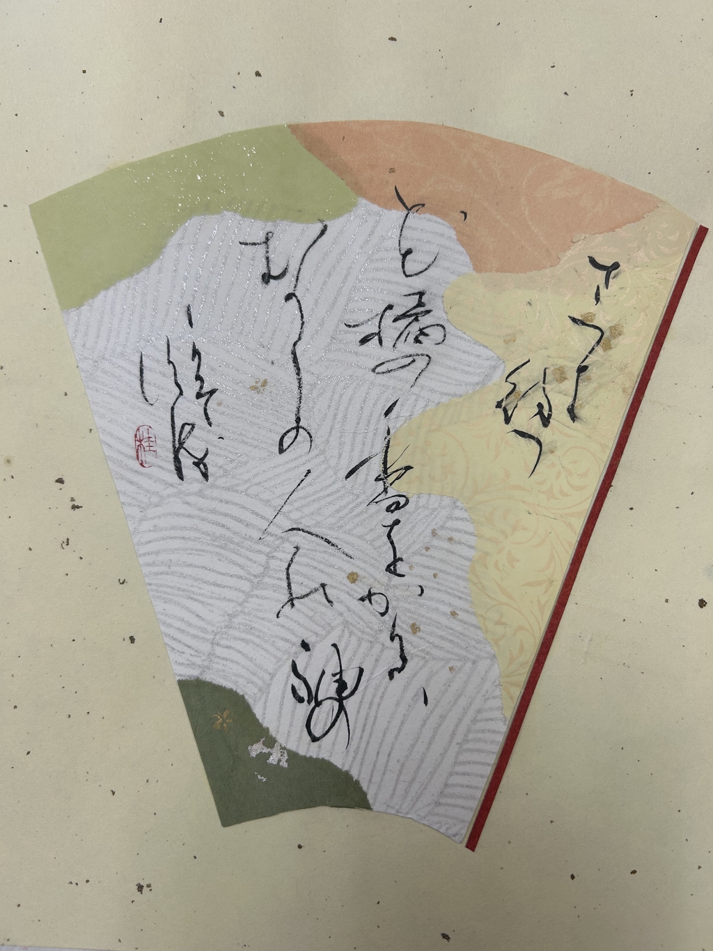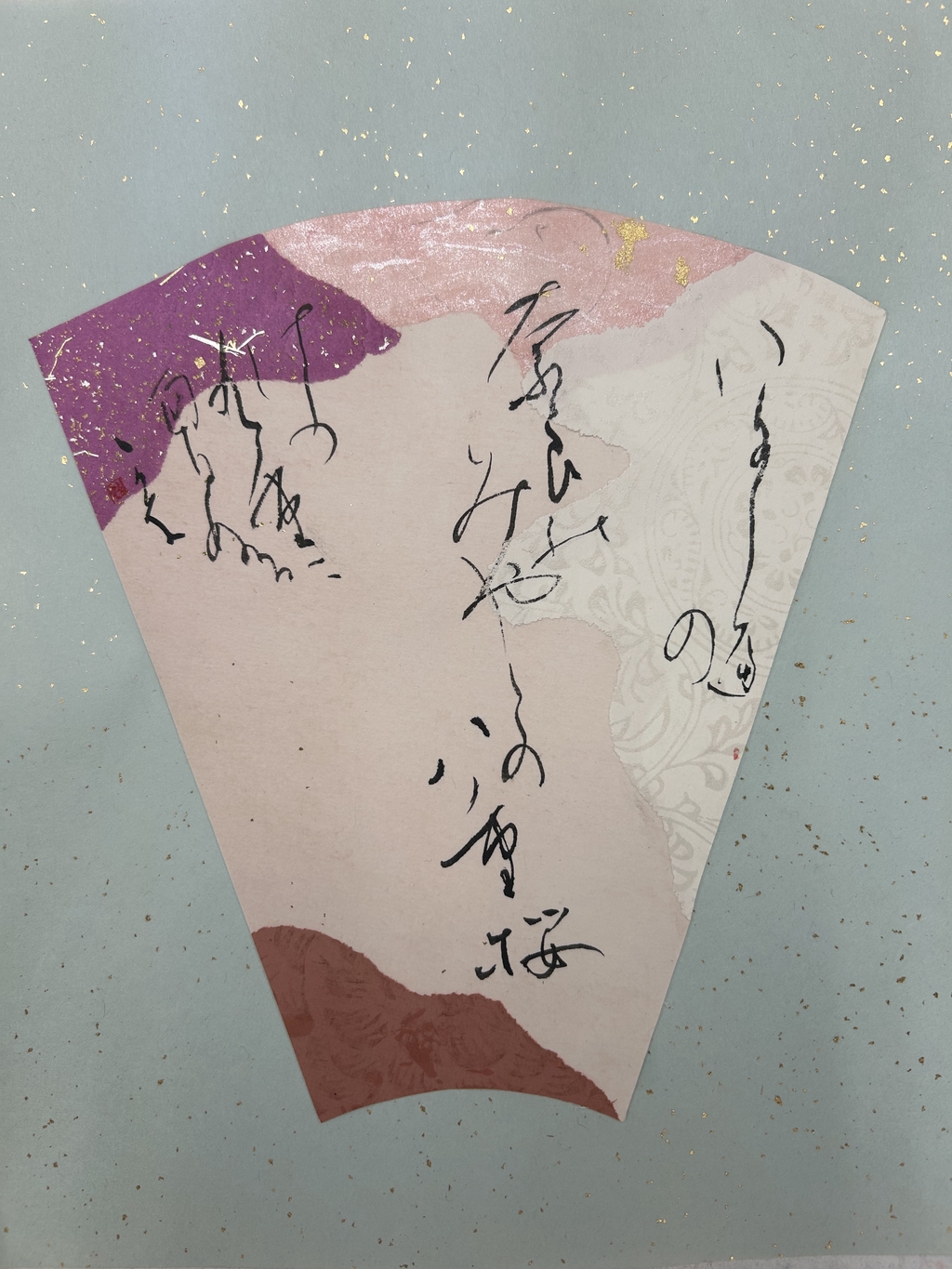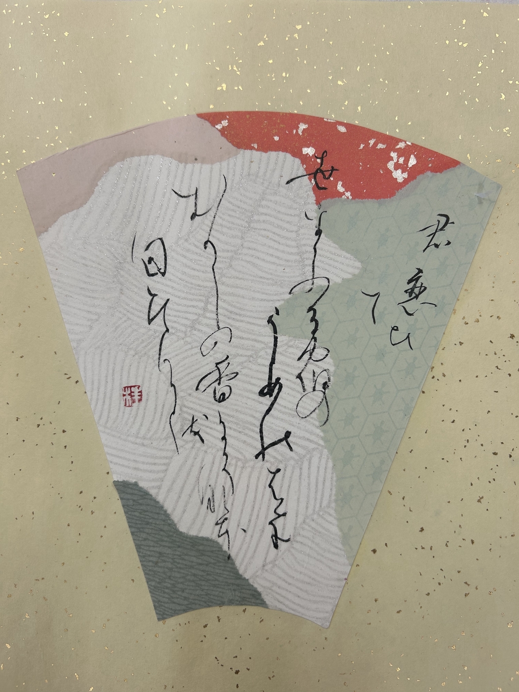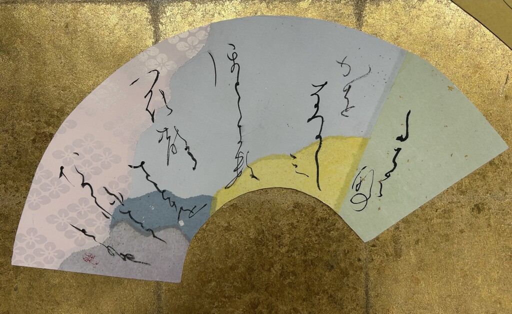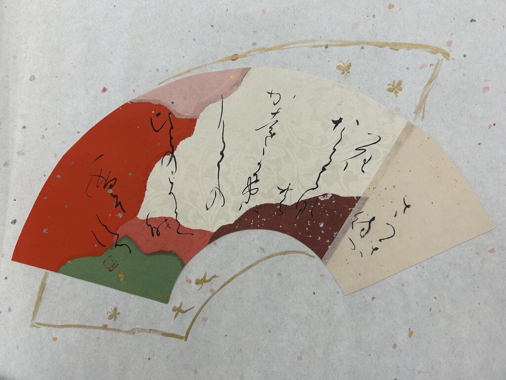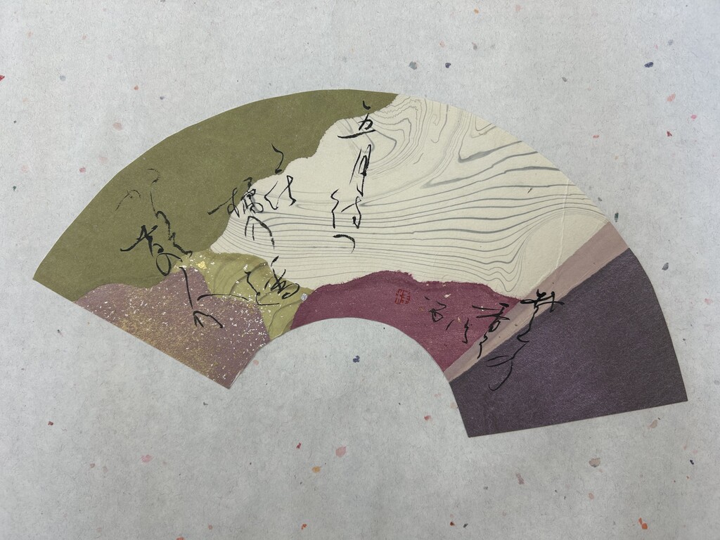 紅梅色を中心に選んだ。香りが波及していく様子を、紙の波模様で表現した。淡い暖色が多く全体的に温かい印象になってしまったため、もう少し寂寥感を出せればよかったと思う。伝西行筆で書いていただきました!