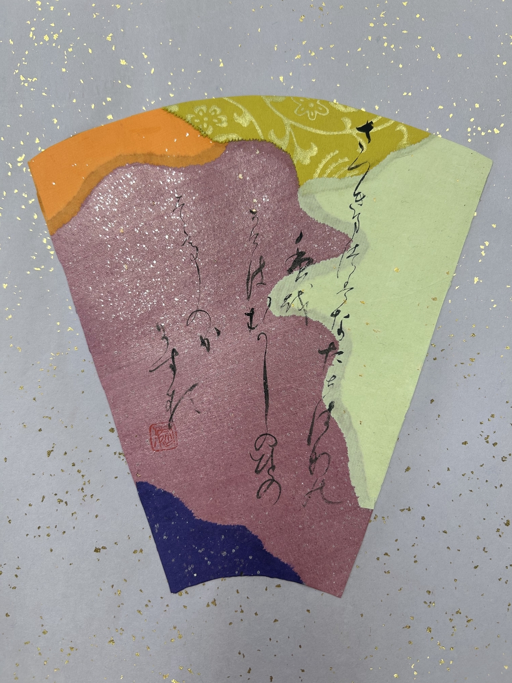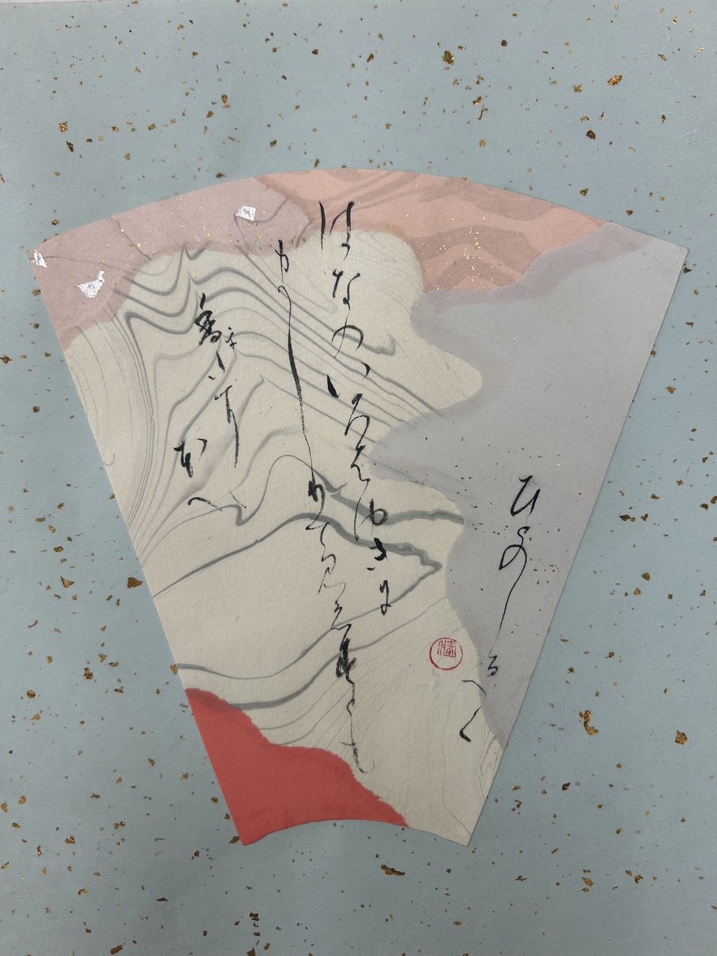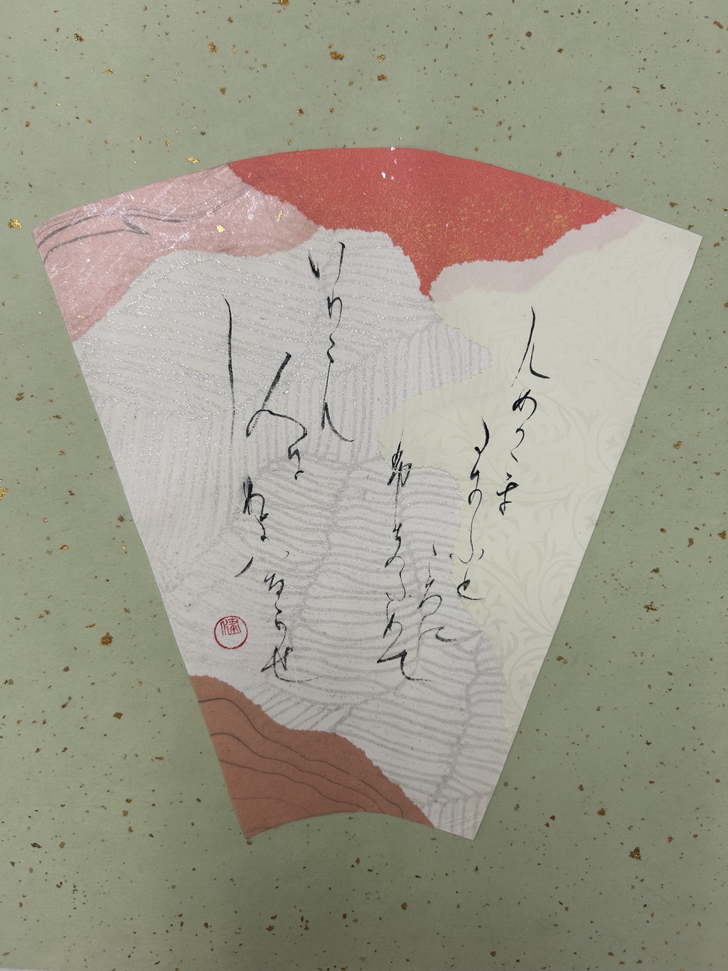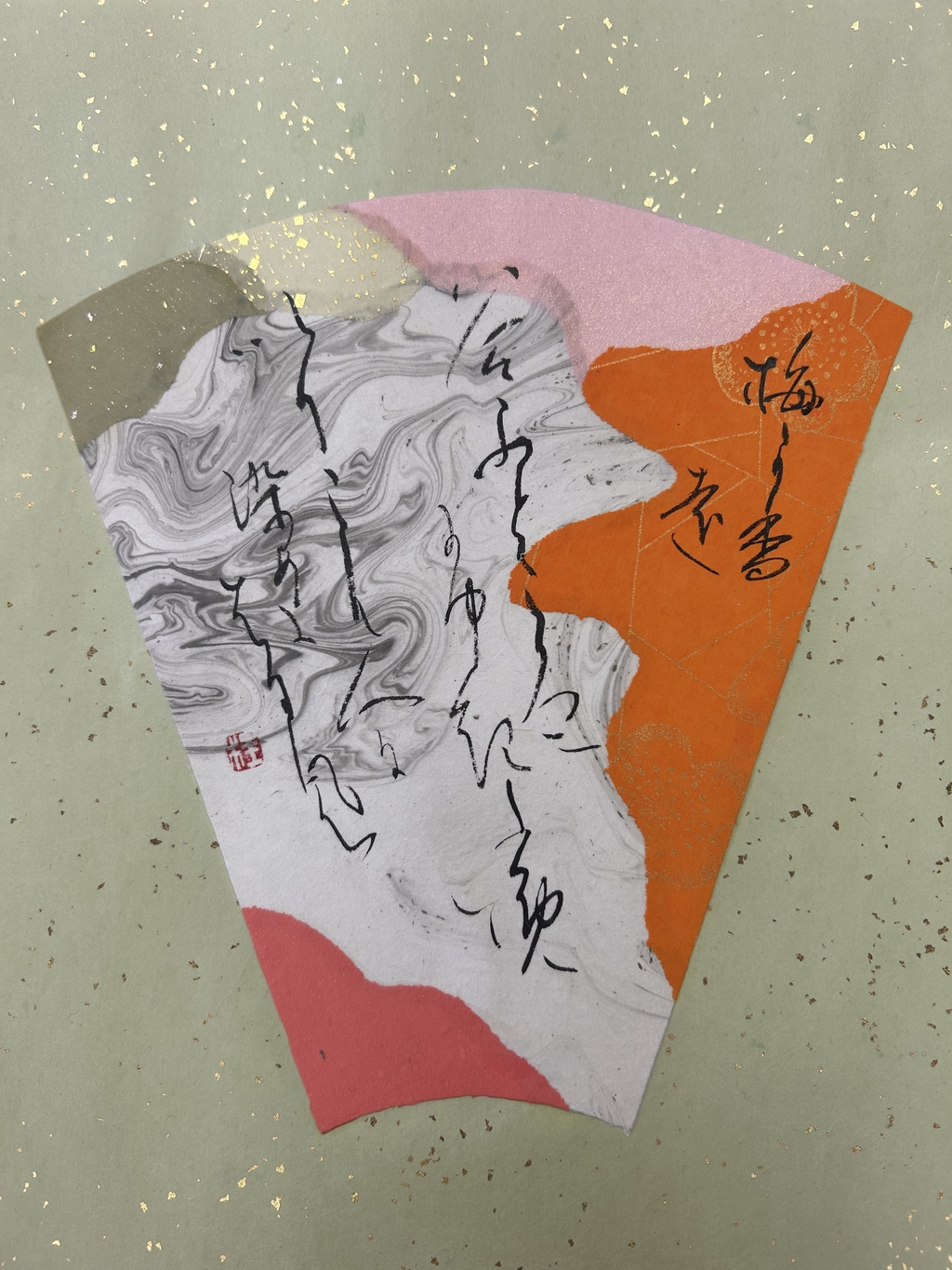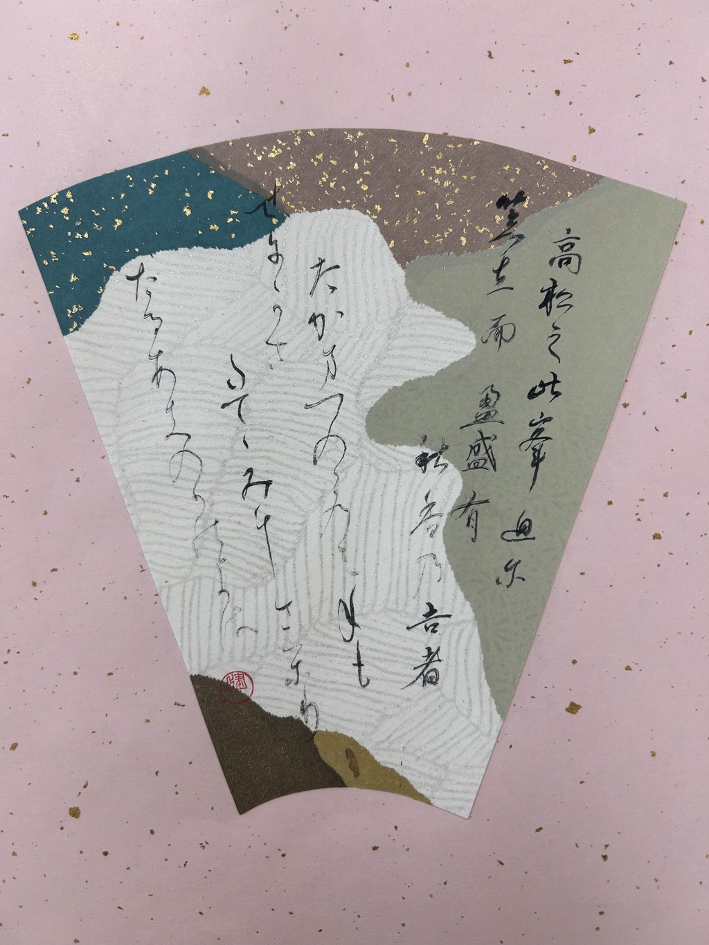 紅梅色を中心に選んだ。香りが波及していく様子を、紙の波模様で表現した。淡い暖色が多く全体的に温かい印象になってしまったため、もう少し寂寥感を出せればよかったと思う。伝西行筆で書いていただきました!