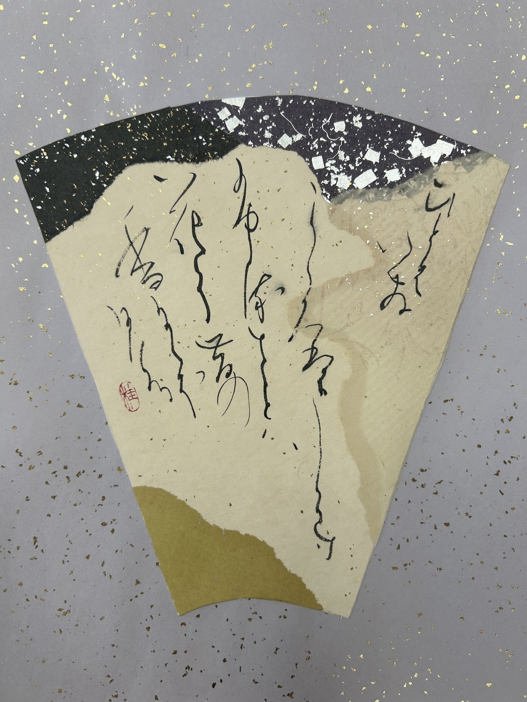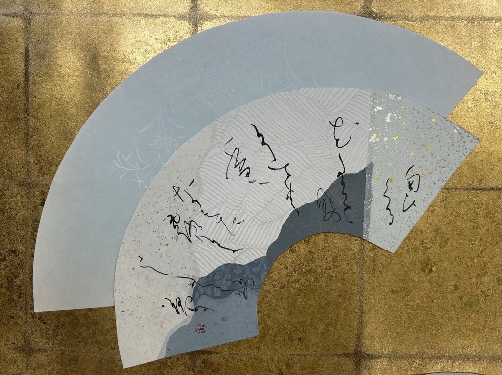 ・明石は自身が受領階級の出であることを強く意識し、その低い出自が娘の将来に影響しないよう、実母としての表立った振る舞いを控える慎ましい女性です。しかし控えめでありながらも気高く聡明で高い教養を備えており、女三の宮や紫の上と並んでも遜色ありません。本場面の「裳」は、本来女房格の者が身に付けるものですが、明石はあえてこれを着用します。そこには自らの身の程を弁えつつ、周囲に遠慮して「ことさら卑下」しようとする慎み深い姿勢が垣間見えます。こうした控えめな佇まいの奥で静かに光る知性と揺るぎない芯の強さ、そして胸の内に秘めた娘への深い愛情を表現するため、扇の下部に金箔・銀箔を僅かに散らした紙を使用しました。華やかさを抑えつつも上品な輝きを放つこの料紙は、控えめながらも自然と人目を引く明石の存在感と響き合い、その人物像を浮かび上がらせています。