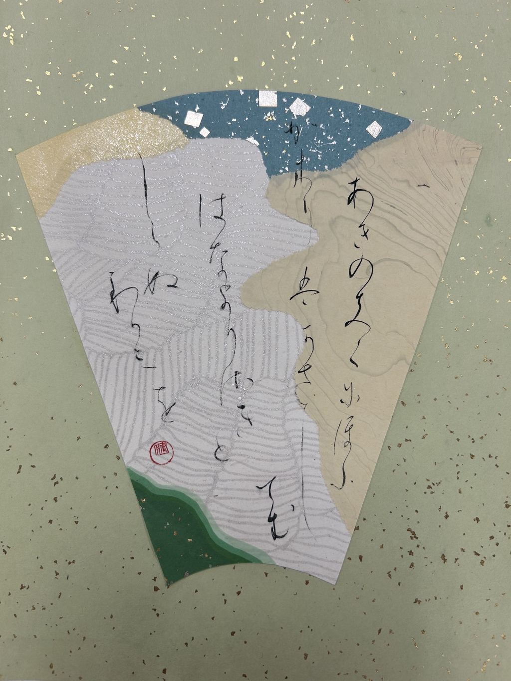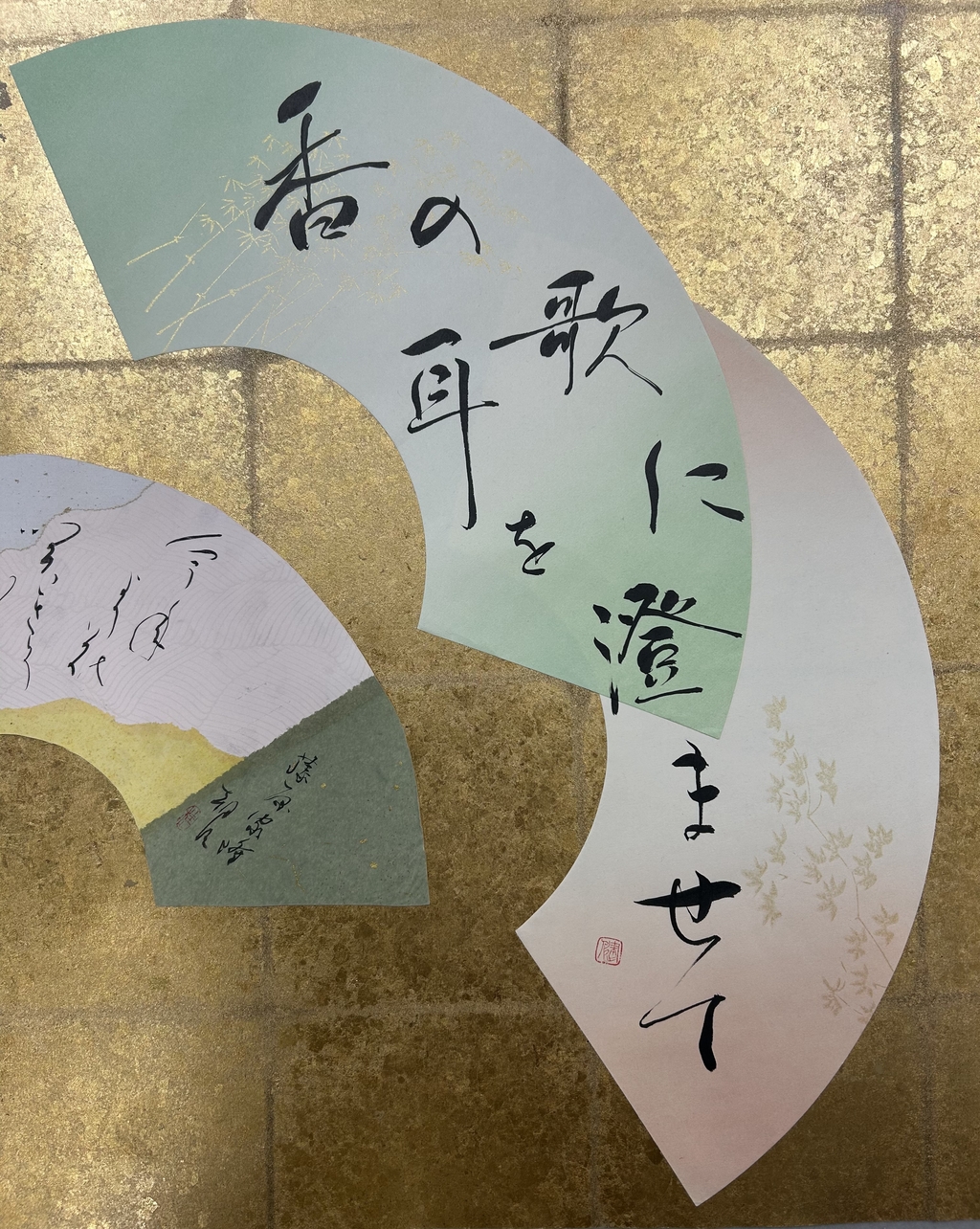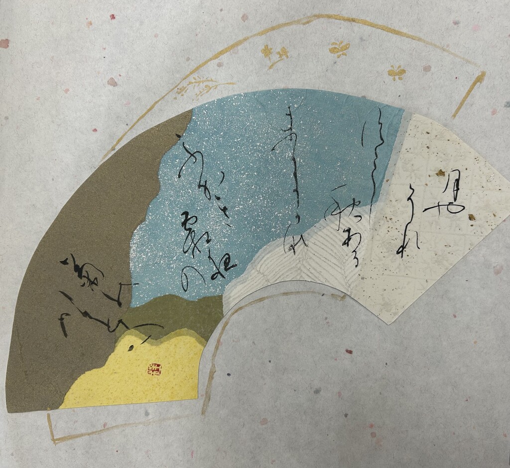 左上の金色、その下の黄色、横の緑色、真ん中の白色でそれぞれ、月、菊、籬、霜を表したくてこの色と配置にしました。また、右の白い料紙には、小さな金色の粒がちりばめられています。冬が近づき星も静かに瞬いている霜夜に、ふっとただよってくる菊の香りが左から右へと流れていくイメージです。