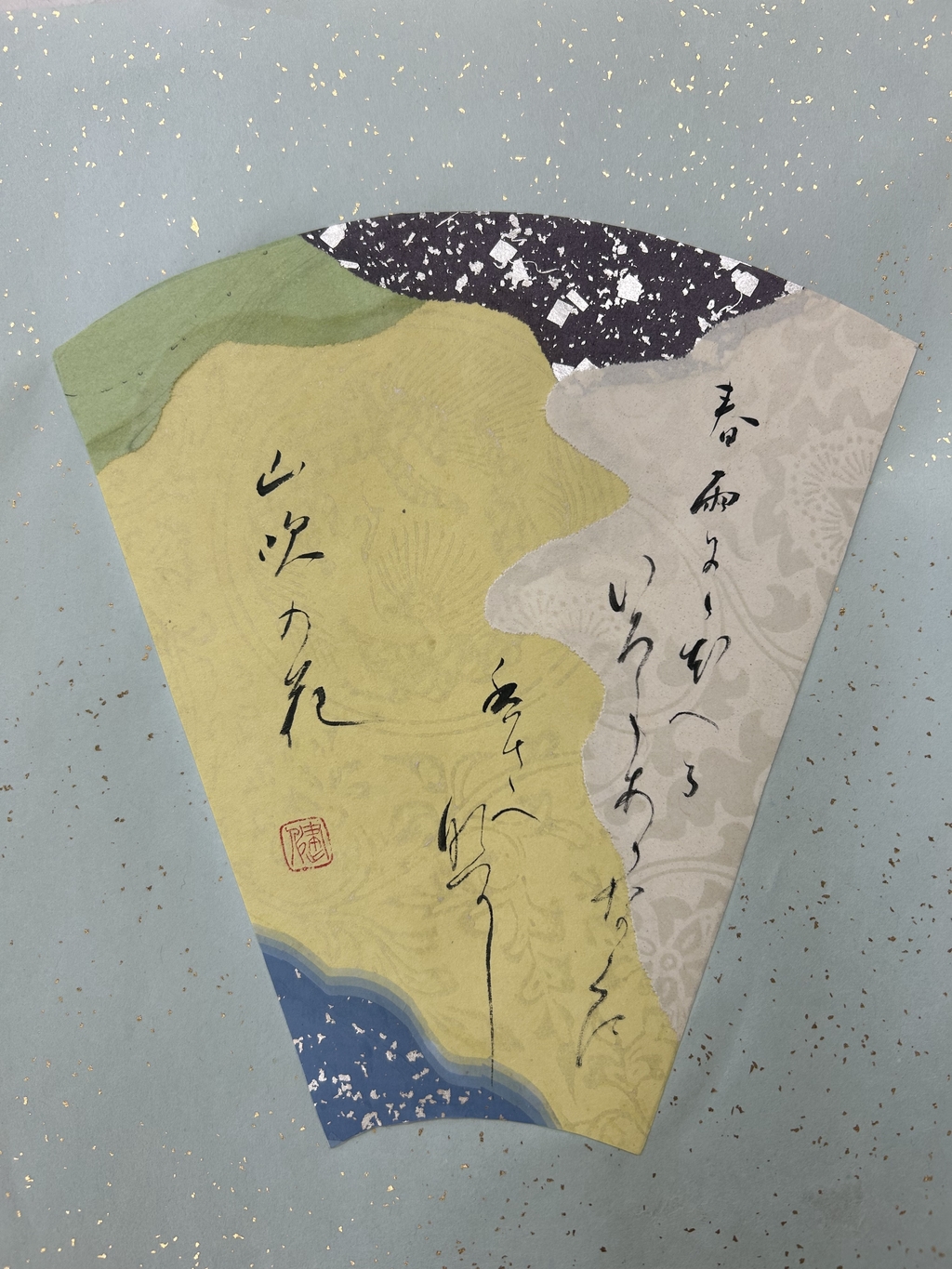 継紙制作に向けた準備期間の季節の秋、またキクタニギクの摘花にかさね、「菊」を題材に歌を選定したため、まずは、菊のイメージカラーの緑と黄、そして、人生の無常を感じていたときの歌、ということで、地に咲く菊(生)と、天上の世界としての空(砂子=命)で取り合わせてみました。