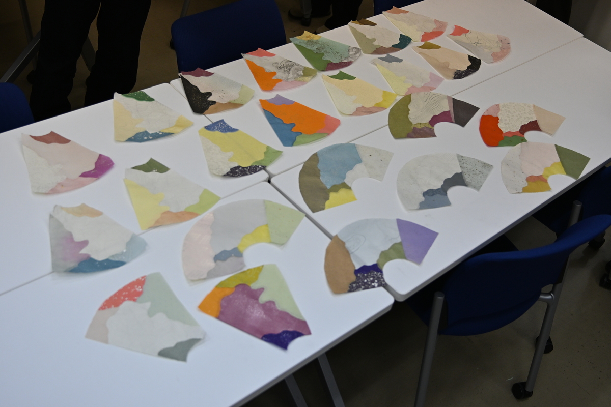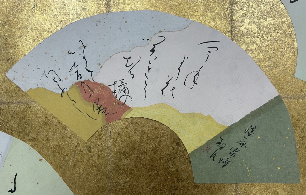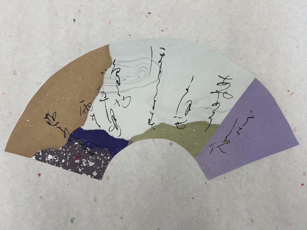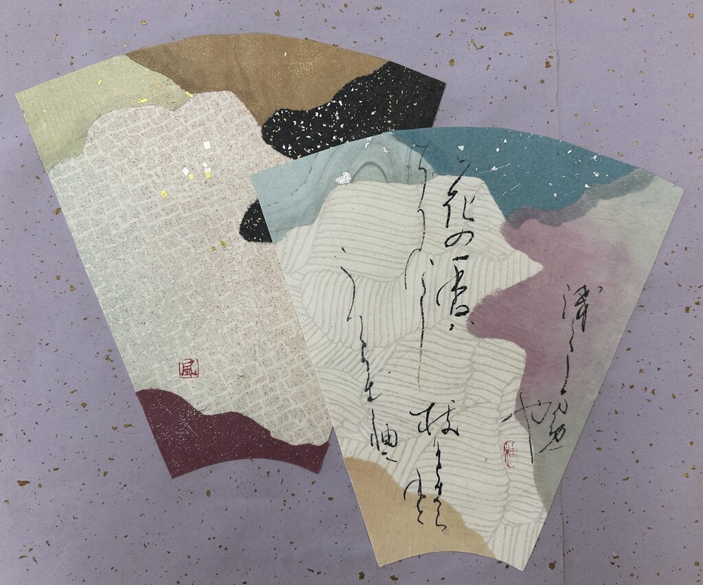 今回は、薫物ワークショップとの関連で、香りにまつわる和歌を選んで、それに合わせた継ぎ紙をつくりました。また、今回のワークショップでは、前年度に作成した人と初めて作成した人とで、別の扇形を用いて継ぎ紙をつくりました。