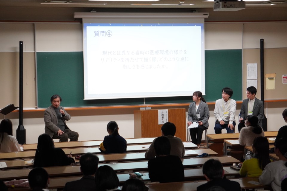 当日は、片渕監督より「一〇〇〇年前の言葉は何を伝えるか」と題しての御講演をいただいた後、監督と学生によるトークショーが行われました。御講演では監督の緻密な考証の一端を見せていただき、参加した学生たちは熱心にスライドを見たり、感嘆の声をあげたりと、会場全体が熱気に包まれていました。